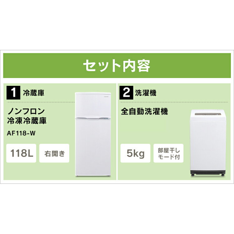 ●セット内容:冷蔵庫 118L+洗濯機 5kg【全自動洗濯機 5.0kg IAW-T502】(アイリスオーヤマ)●種類全自動電気洗濯機●定格電圧AC 100V●定格電源周波数50Hz/60Hz●定格消費電力50Hz:245W60Hz:300W●標準洗濯容量5.0kg●標準脱水容量5.0kg●標準使用水量120L●標準水量46L●防水レベルIPX4●運転音※洗濯:約36dB脱水:約51dB※日本電機工業会洗濯機性能評価基準による●商品サイズ(cm)幅約55.5×奥行約52.5×高さ約92●商品質量約31kg【ノンフロン冷蔵庫 118L AF118-W】(アイリスオーヤマ)●種類ノンフロン冷凍冷蔵庫●冷却方式直冷式●冷媒R600a●ドア数2●商品サイズ(cm)幅約48.0×奥行約52.5×高さ約116.0●質量約30kg●定格電源AC100V 50Hz/60Hz●定格消費電力電動機:49W/46W電熱装置:4W●定格内容積全体:118L冷凍室:28L冷蔵室:99L●ドア開閉方向右開き●電源コード長約1.8m●トップテーブル耐荷重30kgf●トップテーブル耐熱温度100℃●付属品製氷皿※氷を作る際は、製氷皿に8分目位まで水を入れてご使用ください。