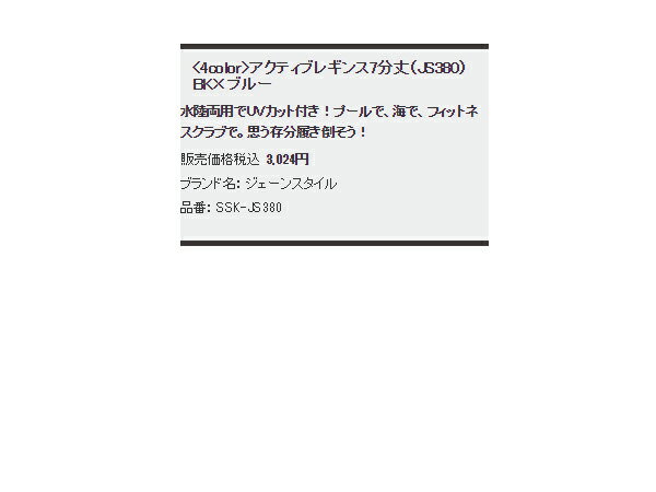 【カテゴリ】 スポーツ ランニング フィットネス トレーニング ヨガ ウェア インナー アンダー パンツ タイツ スパッツ コンプレッション 【品番】 JS380-9060 【対象】 ウィメンズ 女性用 【素材】 ポリエステル82%、ポリウレタン18% 【サイズ】 S/身長:152-158cm ウエスト:59-63cm M/身長:157-163cm ウエスト:62-66cm L/身長:162-168cm ウエスト:65-69cm 【仕様】 ・カラー詳細 9060/ブラック×ブルー 黒系/ブラック系/black系 【商品詳細情報】 水陸両用の7分丈レギンス。