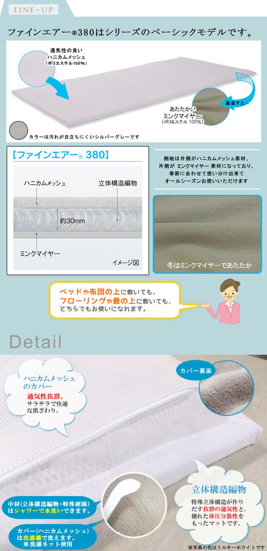 オーシン ファインエアーの特徴 ●シャワーで水洗いOK 立体構造編物は釣糸に使うような太いポリエステル繊維で構成されており、水分を吸収しないことから汚れがつきにくく、シャワーの水洗いでOKです。