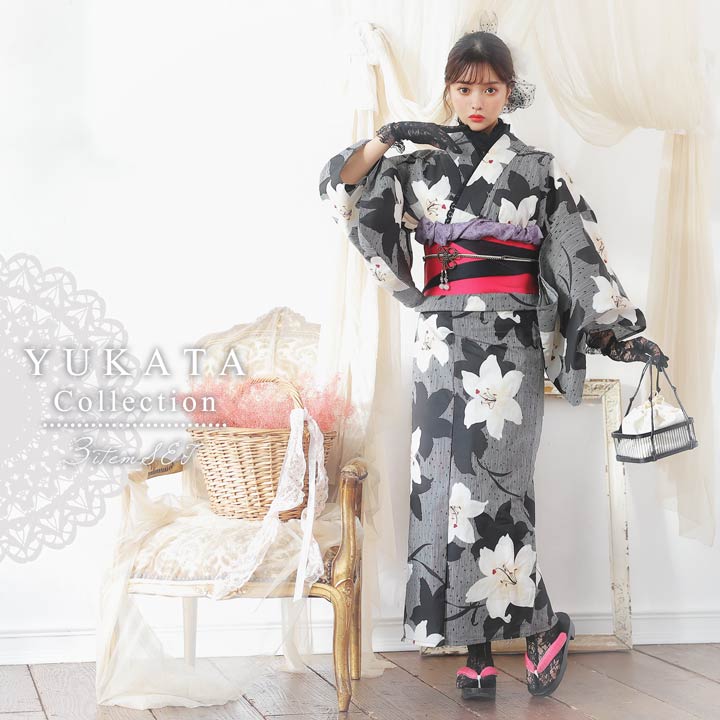 浴衣 セット 白百合 影縞 柄 浴衣 帯 下駄 3点 セット [YUKATA by dazzy]| 浴衣 レディース 浴衣 大人 浴衣 帯 2020 新作 浴衣 平帯 リバーシブル帯 女性用 大人用 和装 和服 和装小物 花柄 フリーサイズ