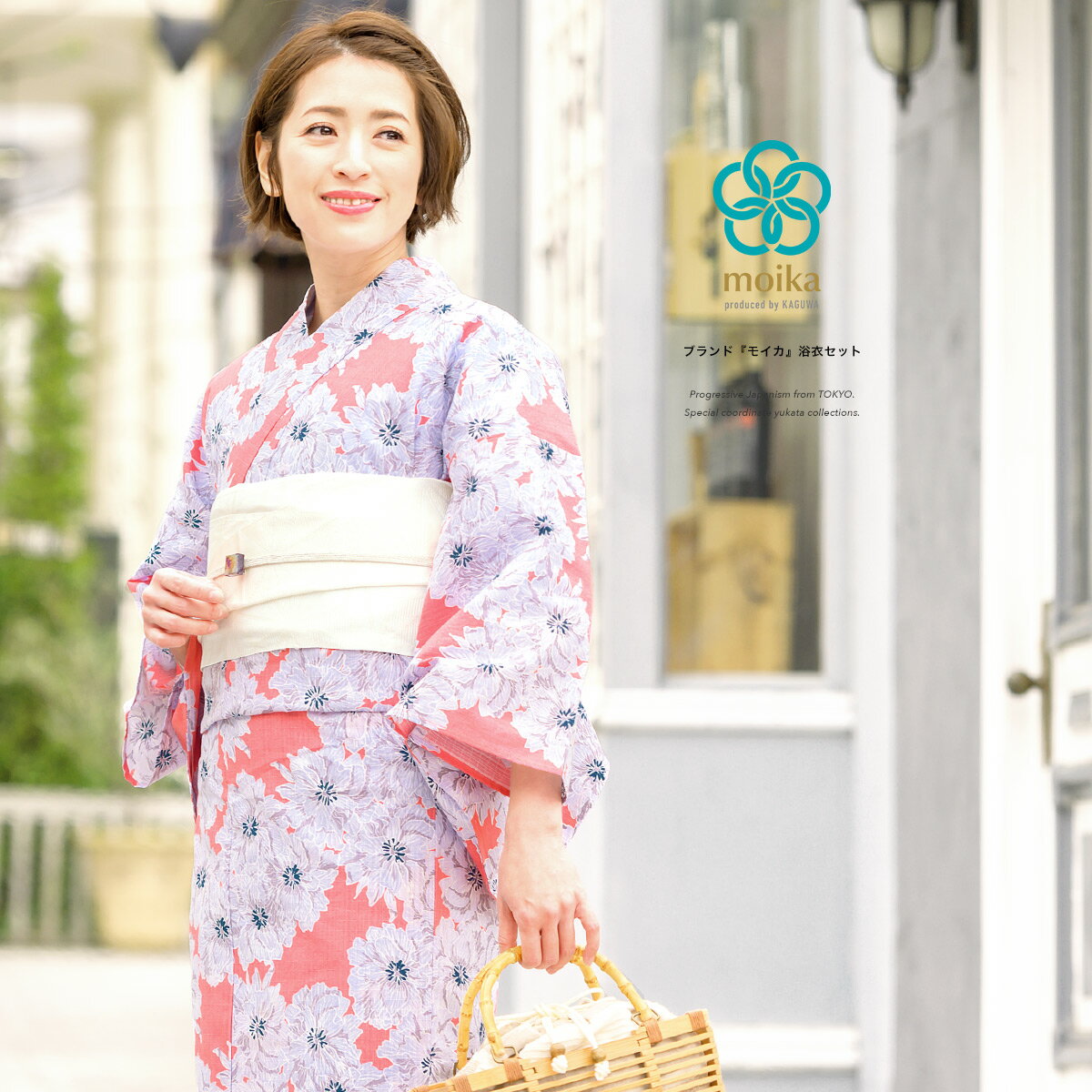 浴衣 セット レディース レトロ 浴衣セット 3点セット ピンク グレー 白 牡丹 花 綿 変わり織り 衿芯付き 女性 半幅帯 moika モイカ 30代 40代 ママ 大人浴衣 【送料無料】【あす楽対応】