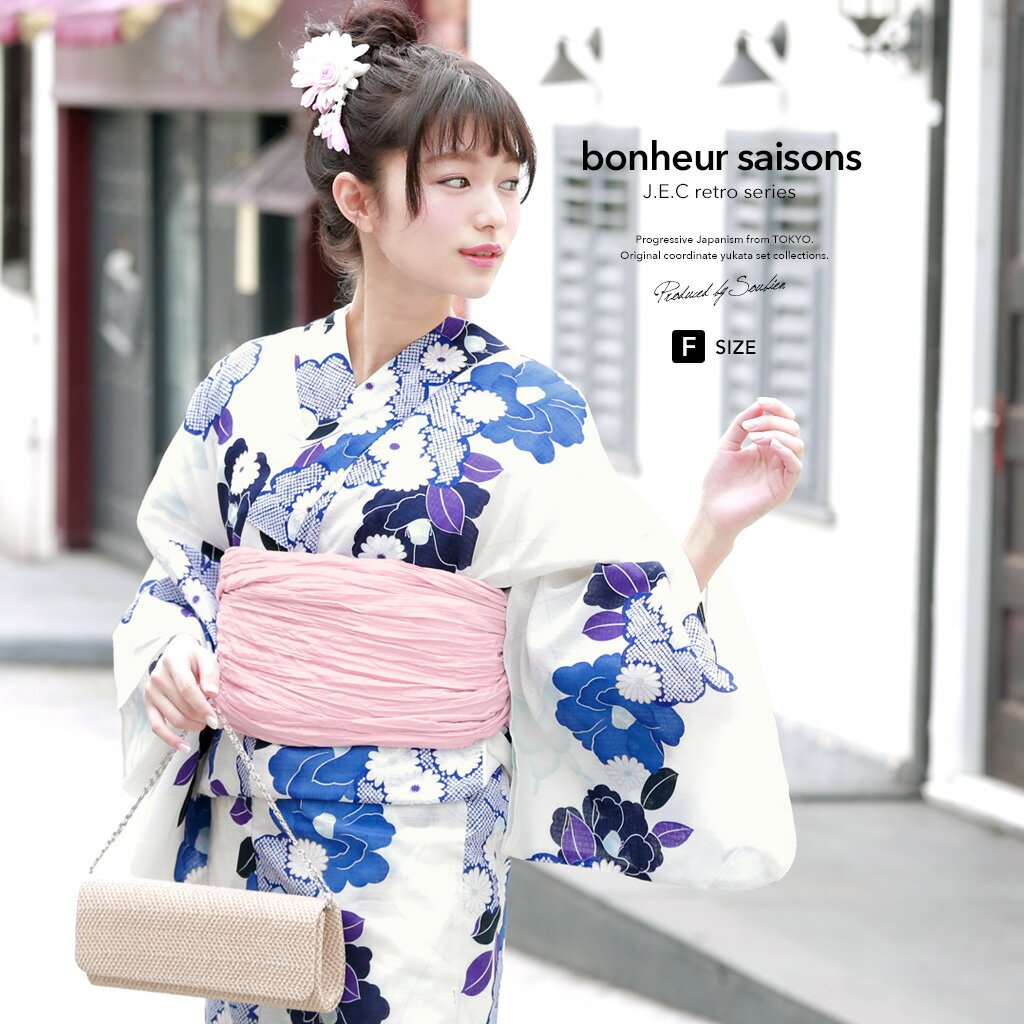 浴衣 セット レディース レトロ 浴衣セット 大人 3点セット 白系 ホワイト 青 ブルー ピンク 椿 菊 蝶 ラメ 綿 紅梅織 兵児帯 女性 ボヌールセゾン フリー 【送料無料】【あす楽対応】【浴衣 セット】