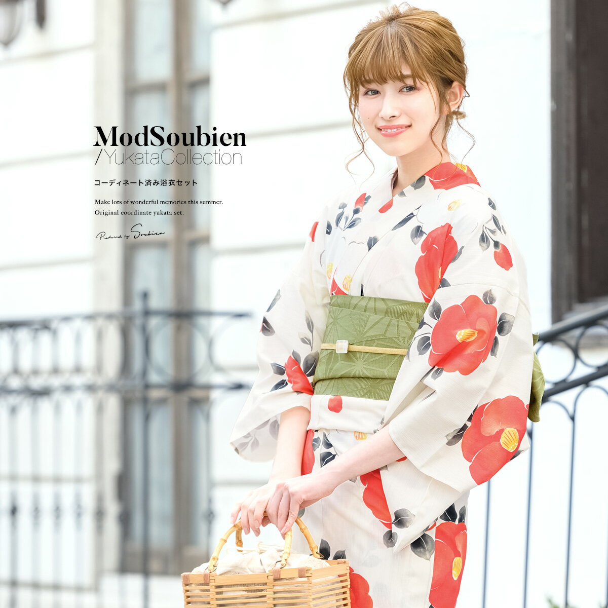 浴衣 セット レディース 2020 レトロ 浴衣セット 大人 3点セット ホワイト 白 レッド 赤 朱 椿 ツバキ 花 フラワー 綿 夏祭り 花火大会 女性用 S・フリー【送料無料】【浴衣 セット】【あす楽対応】