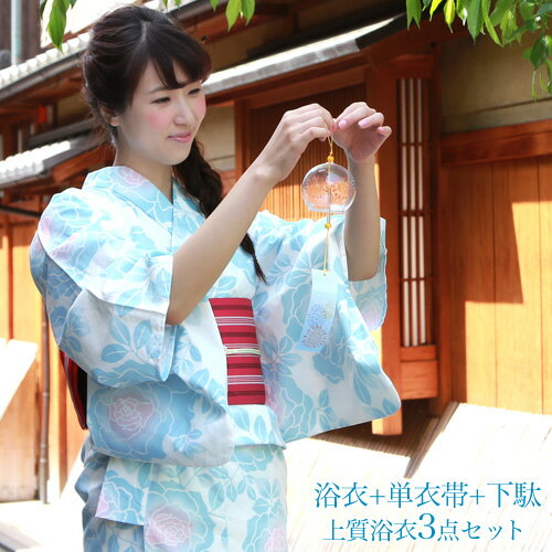 浴衣 セット レトロ 高級変わり織り涼感浴衣3点セット「白地にピンクぼかしの水色バラ」 浴衣 白 水色 薔薇